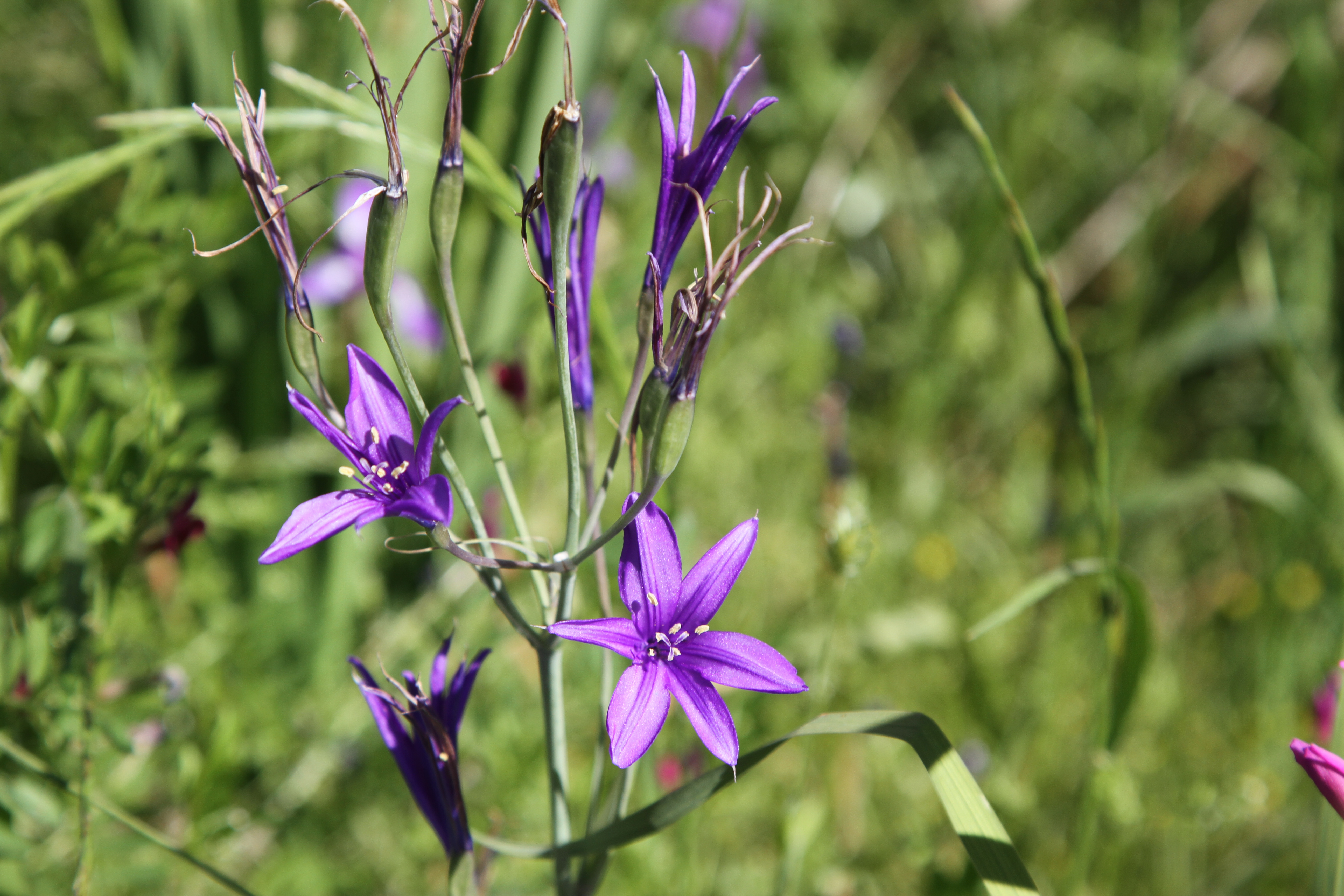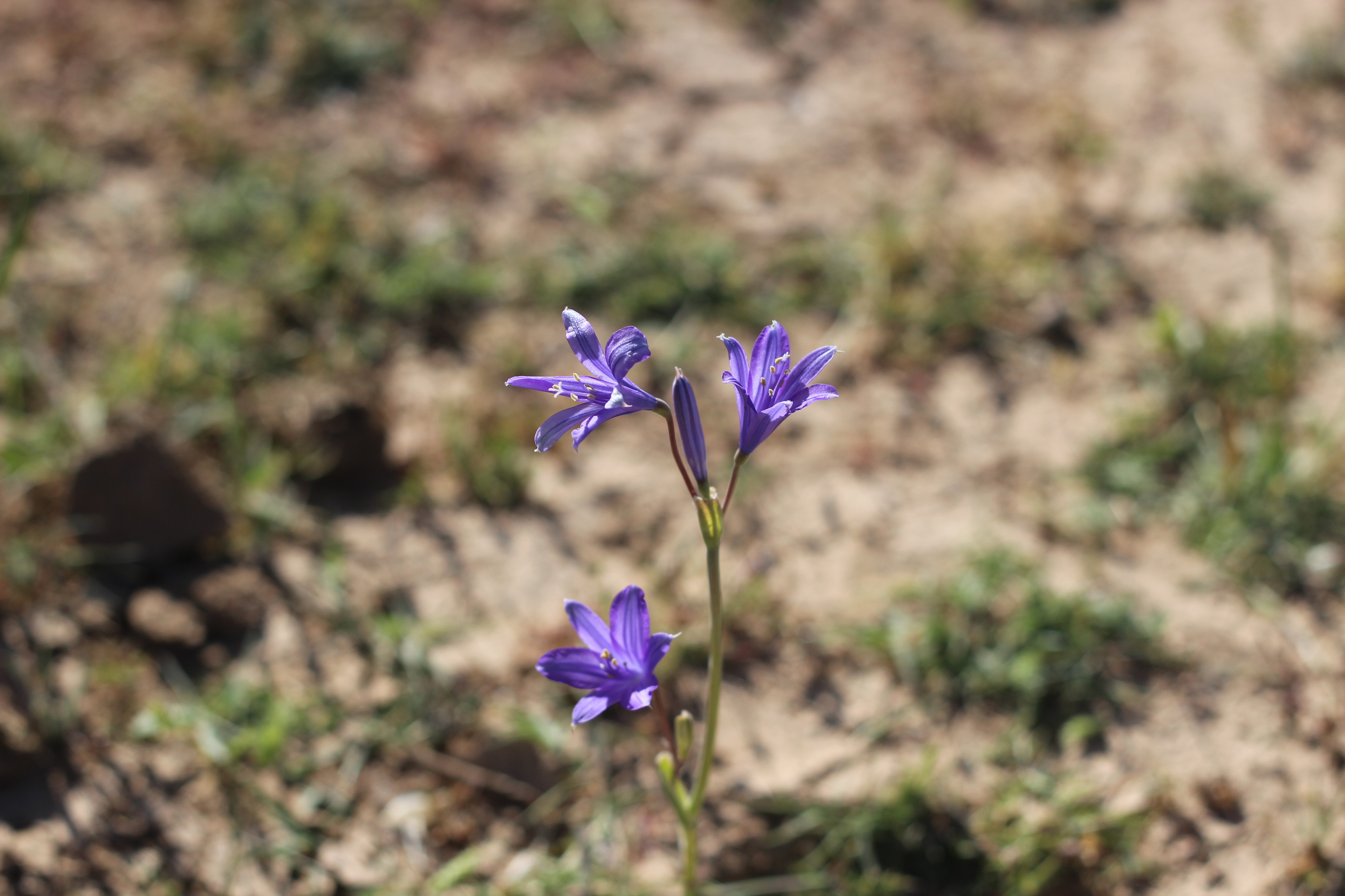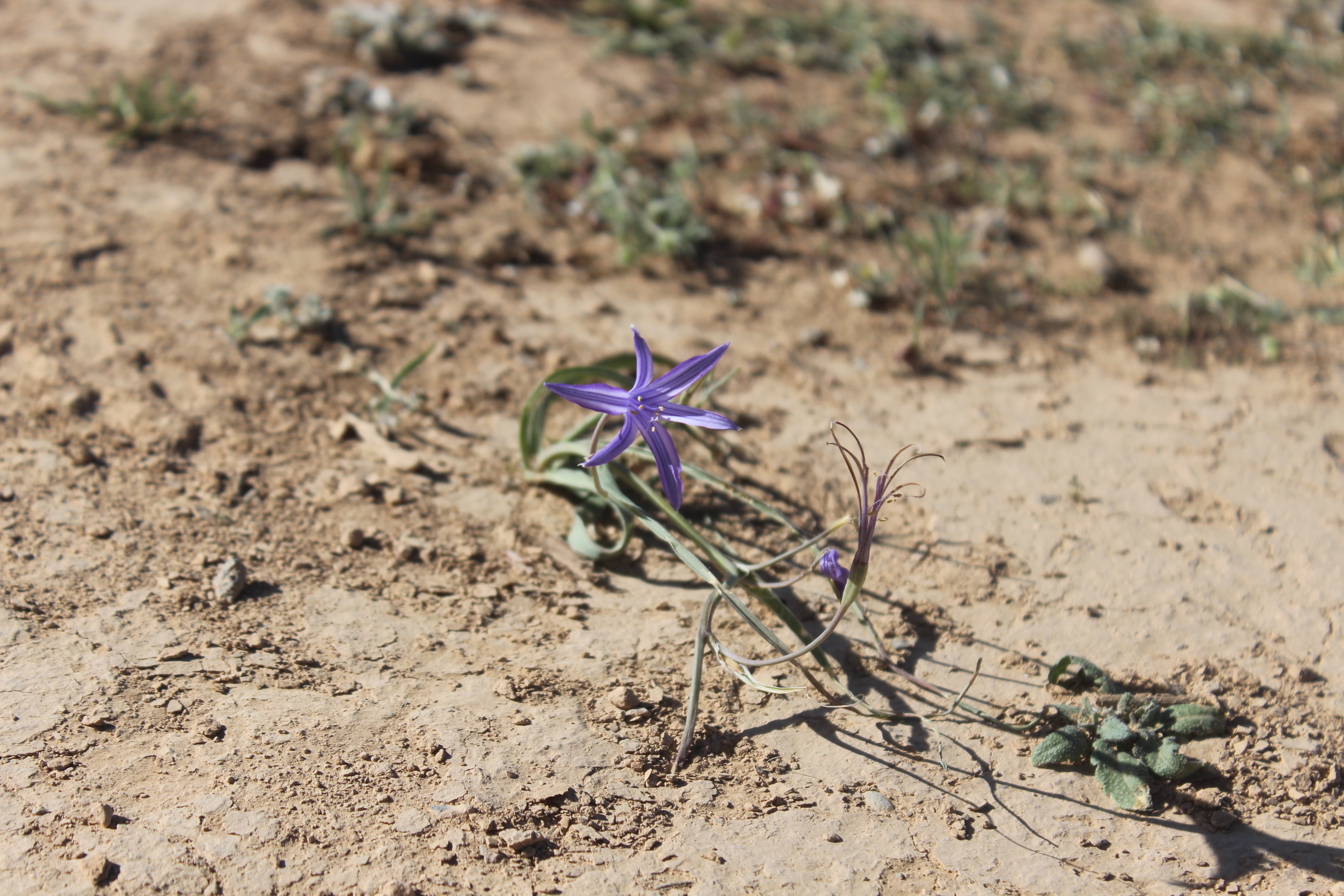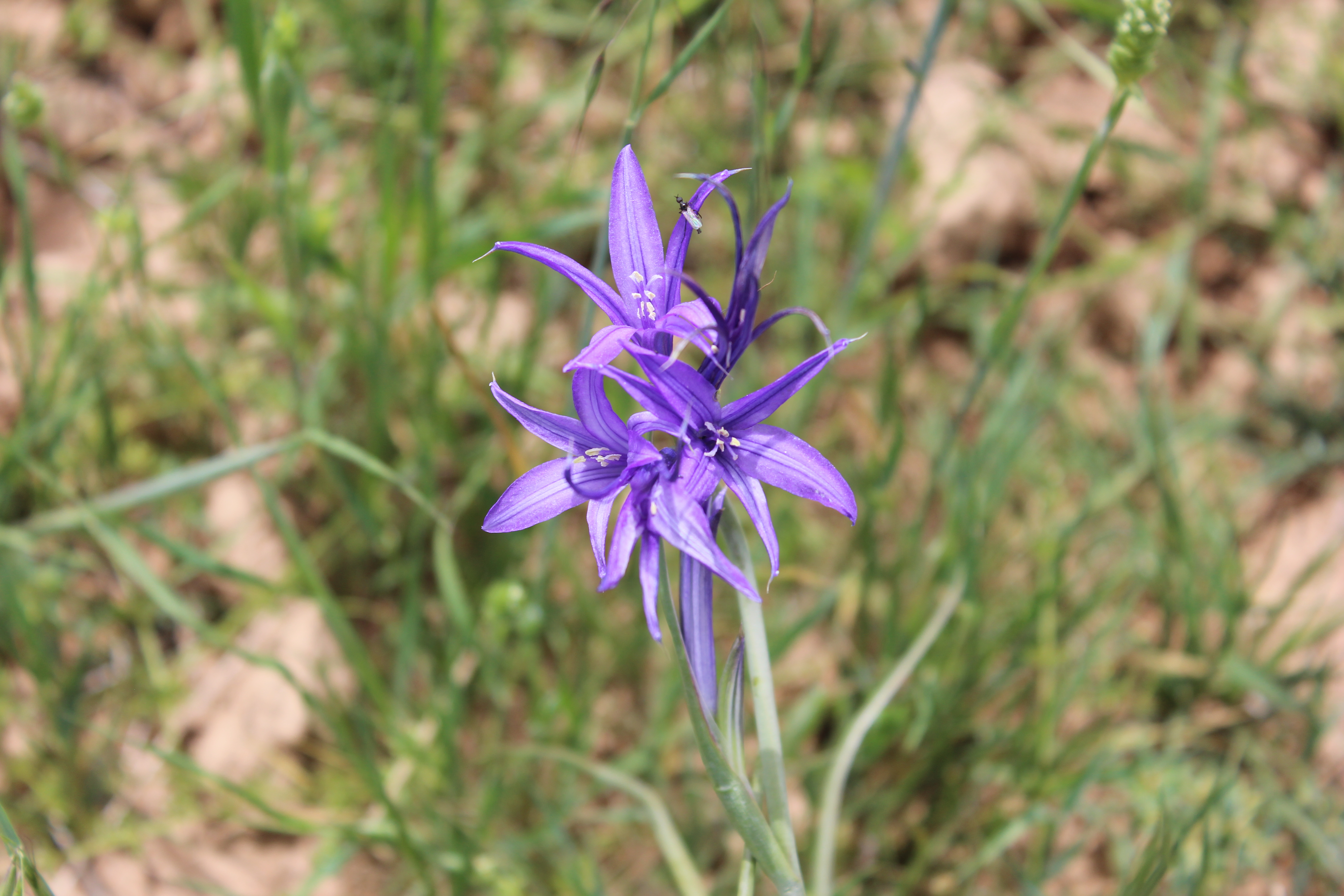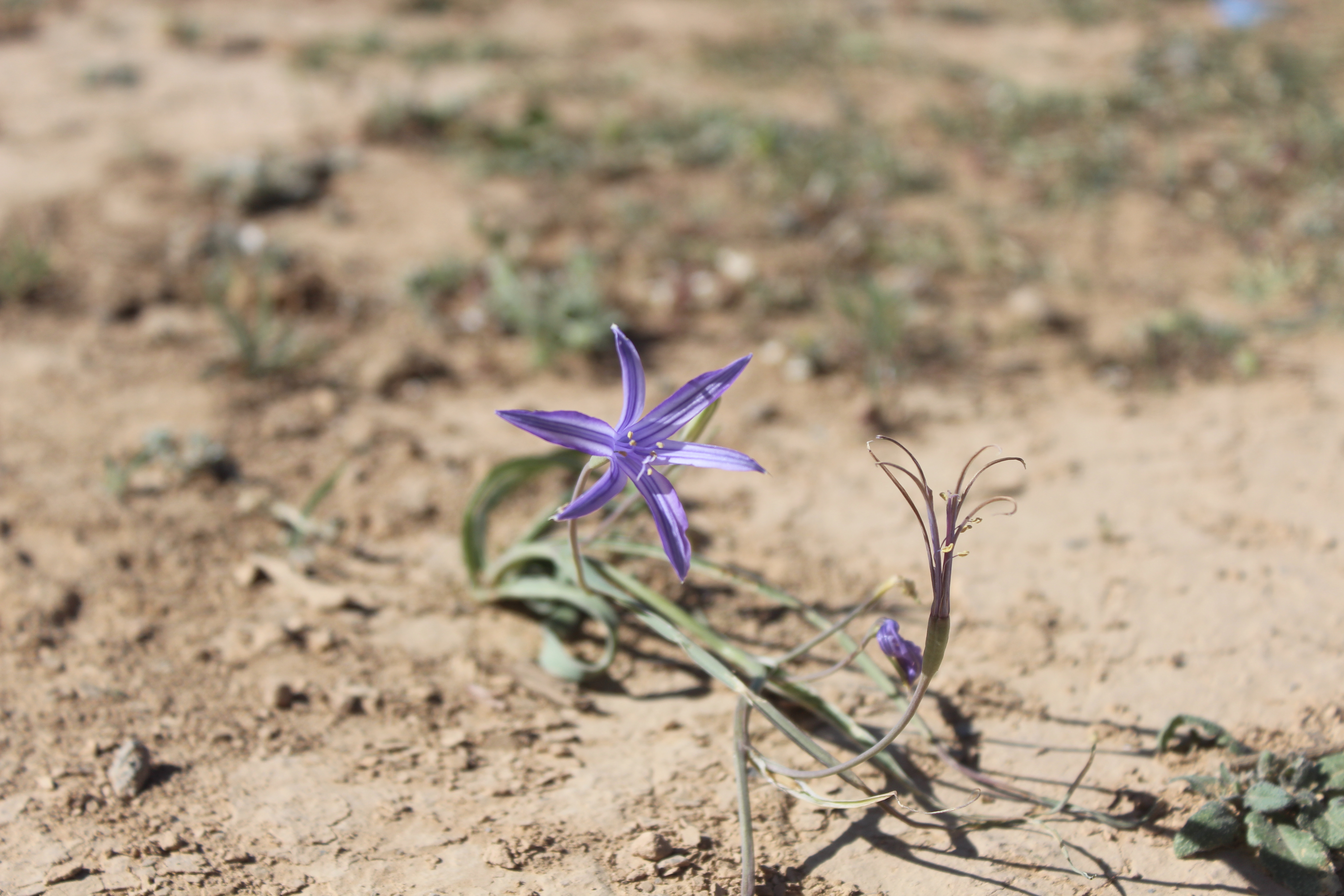 A small perennial ; up to 40 cm high , with globose bulb-like corms , covered with brownish scales . Stems erect to asecending , long , c . 30 cm , weak , slender , pale green . Leaves alternate , erect to spreading , long , slender , pale green , linear to falcate , entire margin , sheathing at base , glabrous . Inflorescences of a terminal umbellate cluster , up to 3-4 flowers on the stem . Flowers bright blue to purple , star-shaped ; stamens 6 , in 2 whorls , free , unequal in length ; filaments purple , free to the base ; anthers slightly sagittate ; style bluish purple , 3-lobed ; stigmas 3 , purple . Fruit capsule , oblong . Seeds many . (Ref . Flora of Oman ; vol . 4) .
